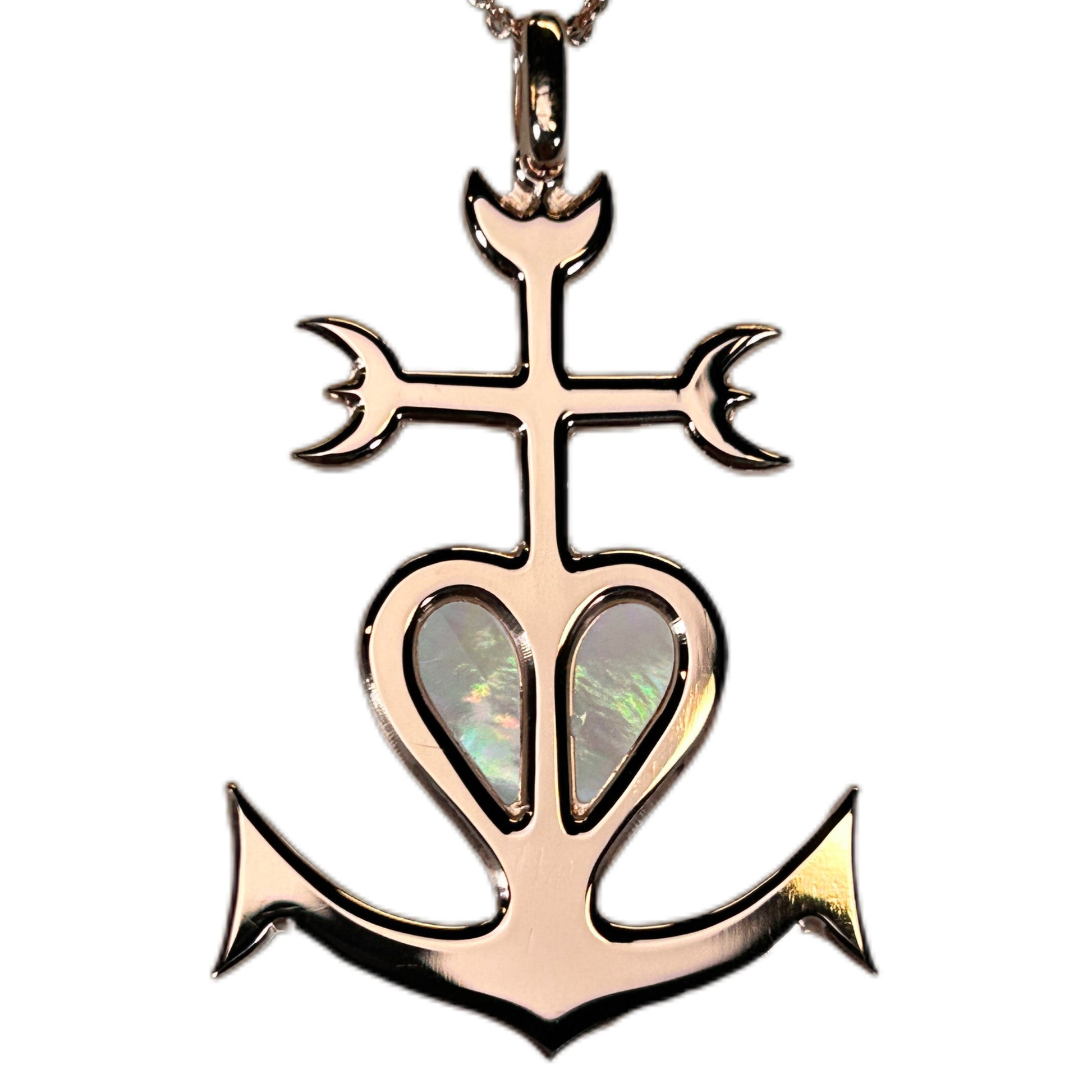 CROCE DELLA CAMARGUE, CON SFONDO IN MADREPERLA, CROCE GITANA CON ANCORA E CUORE.