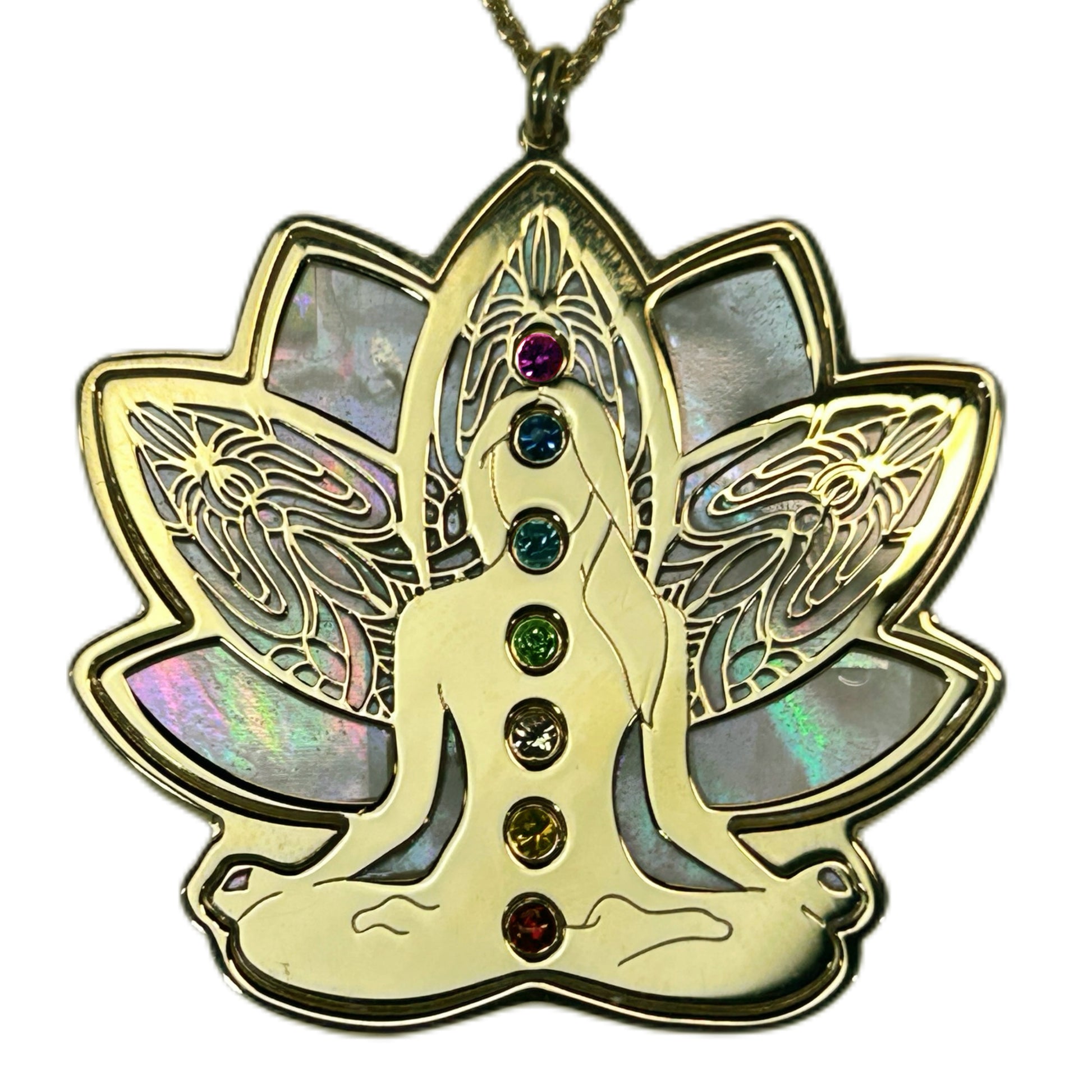 Ciondolo raffigurante Padma, in sanscrito il fiore di loto, è un simbolo di origine trascendentale la cui origine si perde nel tempo. Riveste un'importanza centrale nei miti della creazione dell'antico Egitto e dell'India perché associato a molte divinità: Lakashimi, la dea dell'abbondanza viene spesso rappresentata seduta su un fiore di loto aperto e così anche Ganesha, dio che abbatte gli ostacoli e Vishnu, il dio che rappresenta la conservazione dell'Universo. Per trasposizione è l'archetipo delle asana dello yoga in cui la postura di mani e piedi richiama il dispiegarsi di un fiore di loto.